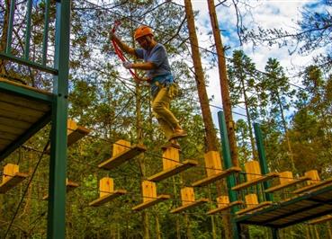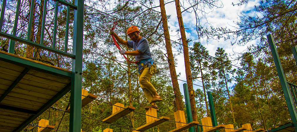 丛林穿越最早起源于哥斯达黎加的茂密雨林,当地的冒险生物学家为了进入到难以进入的生态系统中,设计了这种在大树上建立平台和平台之间拉接缆绳的模型,至今已经有十多年的发展历程。在国外叫“树上穿越主题公园”、"树上冒险公园"、“森林探险公园”、"飞越丛林"、"冒险树"、"快乐猴子"等。在欧美,休闲探险活动已逐渐成为一种新时尚运动。丛林穿越的线路架设在离地三到四米的空中,总长240米左右,游客从起点出发后,要跨越跷跷板、攀爬墙、溜索等障碍,随着体验的进行,体验的难度也随之增加。通过爬、滑、游、跨、跳、飞等动作越过所有障碍,到达终点。在整个运动中,汇集了高空、速度、力量、毅力等户外探险所必备的元素,为参与者提供了感官上的刺激。